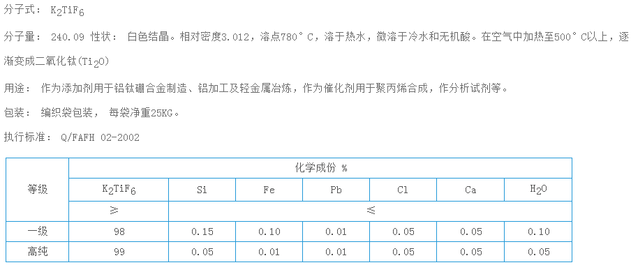 分子式: K 2 TiF 6 分子量: 240.09 性狀: 白色結晶。相對密度3.012,溶點780C,溶于熱水,微溶于冷水和無機酸。在空氣中加熱至500C以上,逐漸變成二氧化鈦(Ti 2 O) 用途: 作為添加劑用于...